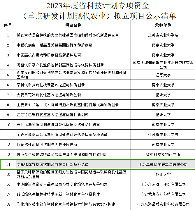 近日,江蘇省財政廳、科技廳公布了2023年度省重點研發(fā)計劃(現(xiàn)代農(nóng)業(yè))專項資金立項項目名單,江蘇高郵鴨集團承擔(dān)實施的“高郵鴨優(yōu)異基因挖掘及節(jié)糧肉用新品系選育”榮獲省重點類科技項目立項支持。