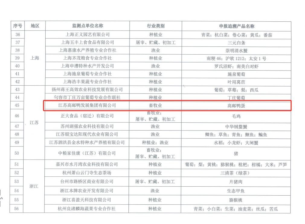 高郵鴨集團入選全國農(nóng)產(chǎn)品質(zhì)量安全良好追溯監(jiān)測試點名單