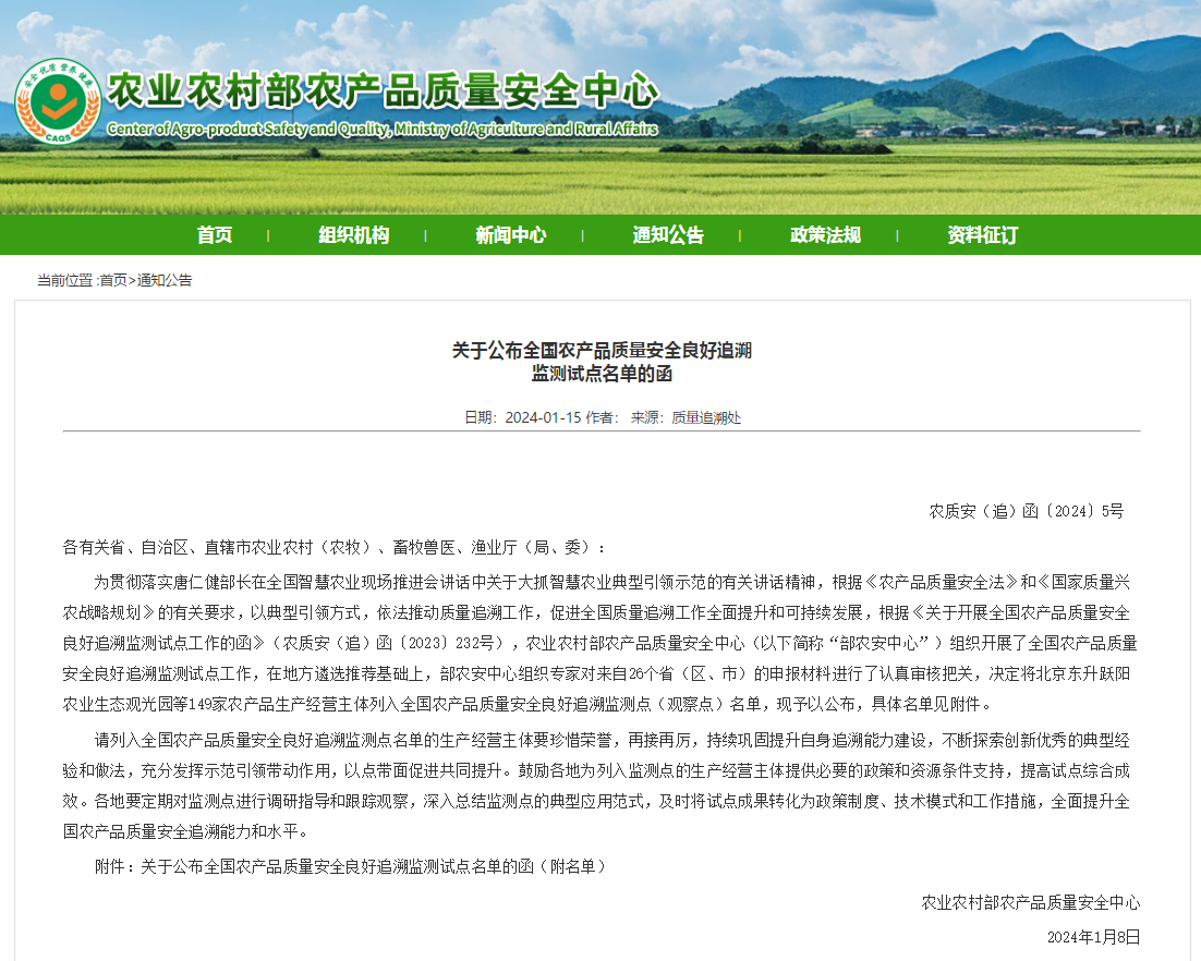 近日,農(nóng)業(yè)農(nóng)村部農(nóng)產(chǎn)品質(zhì)量安全中心公布了全國農(nóng)產(chǎn)品質(zhì)量安全良好追溯監(jiān)測試點名單,在自主申報、遴選推薦、專家審核的基礎(chǔ)上,擇優(yōu)選取基礎(chǔ)較好、常態(tài)化開展質(zhì)量追溯的規(guī)?;r(nóng)產(chǎn)品生產(chǎn)經(jīng)營主體作為良好追溯監(jiān)測點,江蘇省共8家,高郵鴨集團以完整的產(chǎn)業(yè)鏈條和良好的質(zhì)量安全體系成功入選。