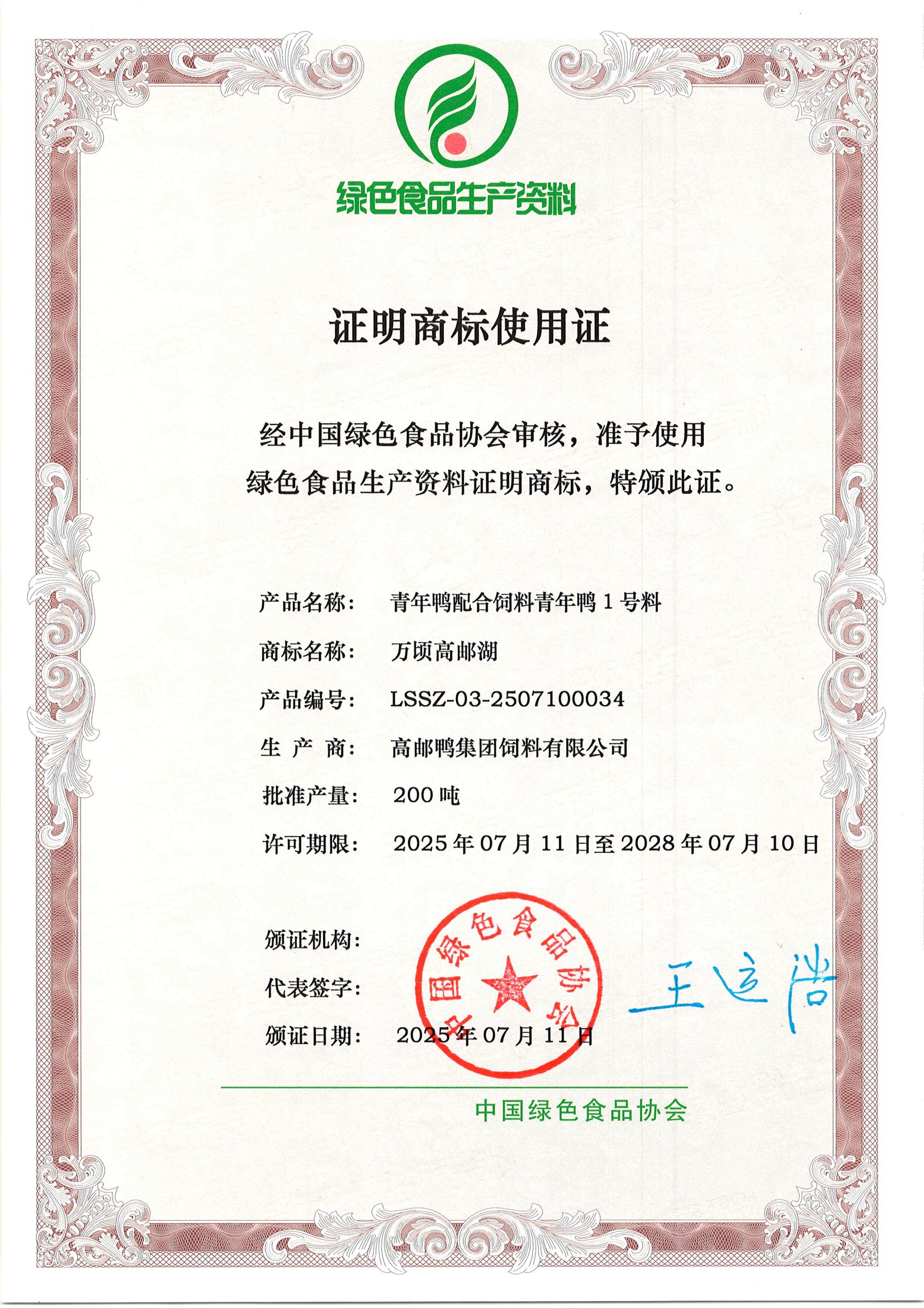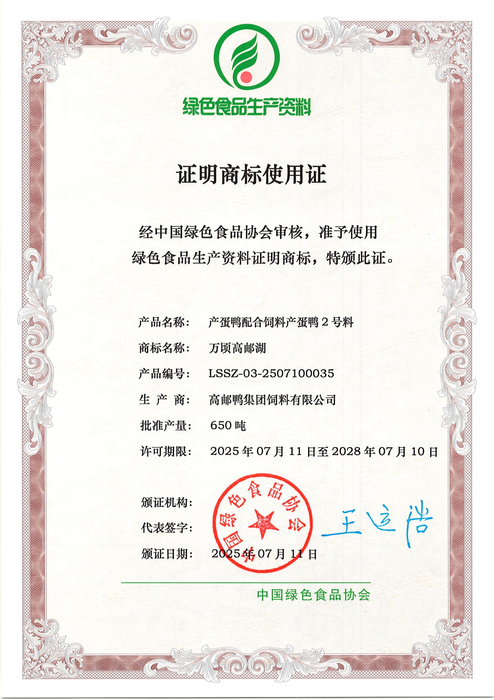 近日,高郵鴨集團申報的蛋鴨配合飼料成功通過中國綠色食品協(xié)會的最終審核,并獲得綠色食品生產(chǎn)資料證明商標(biāo)使用證。這一“綠資”認證是國家層面認可的綠色食品生產(chǎn)投入品的最高級別認證之一,為高郵鴨集團產(chǎn)品進入高端農(nóng)產(chǎn)品生產(chǎn)供應(yīng)鏈、拓展綠色食品相關(guān)市場提供了關(guān)鍵資質(zhì)支撐。
